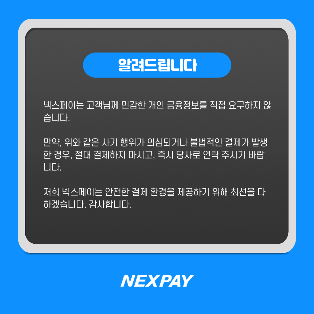 넥스페이는 고객님께 민감한 개인 금융정보를 직접 요구하지 않습니다. 만약, 위와 같은 사기 행위가 의심되거나 불법적인 결제가 발생한 경우, 절대 결제하지 마시고, 즉시 당사로 연락 주시기 바랍니다.