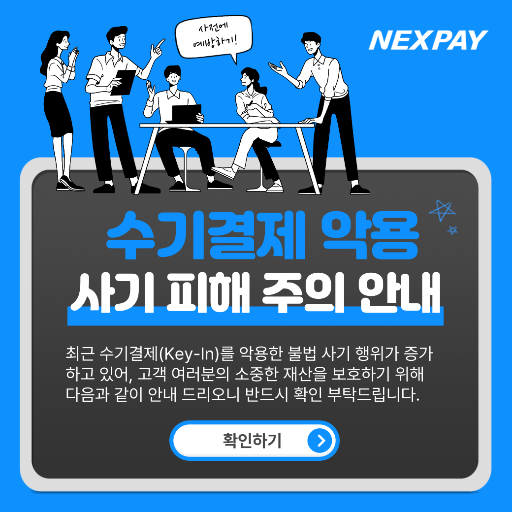 최근 수기결제(Key-In)를 악용한 불법 사기 행위가 증가하고 있어, 고객 여러분의 소중한 재산을 보호하기 위해 다음과 같이 주의를 당부 드립니다.